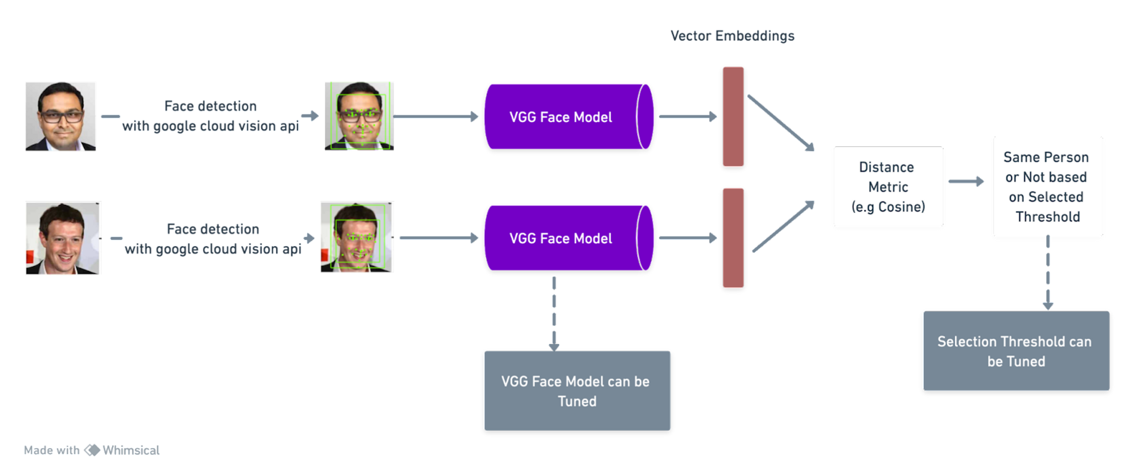 To establish a reliable face verification system, it's essential to follow a well-defined pipeline. A good pipeline involves passing two images intended for verification, first through a face detection model, such as OpenCV or Google Cloud Vision. Subsequently, the result is then passed through a model capable of representing the images as embeddings, such as the VGG Face Model or Facebook’s Deep Lab. Finally, a distance metric, like the cosine distance metric, would be used to assess the similarity between these images. If the value of the distance falls below a certain predefined metric, the images are considered similar; otherwise, they are deemed different. A visual representation of this entire process is illustrated in Figure 1 below.