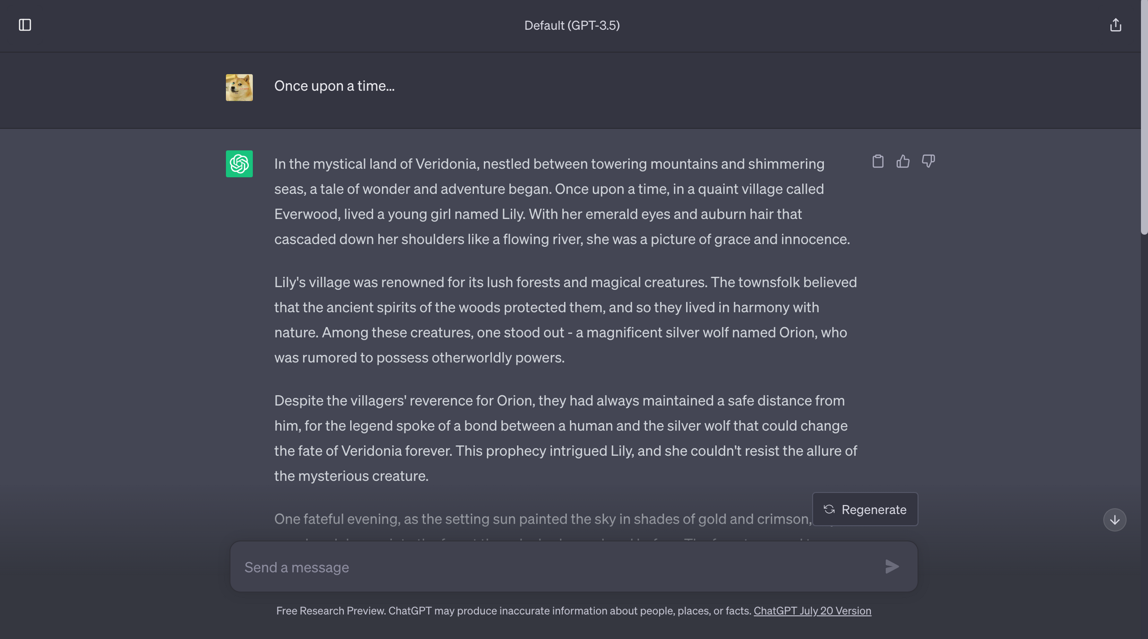 And, voila! Here’s where the magic happens! The Generative AI system has received a prompt, done the heavy lifting in the backend with the algorithm it’s been trained on, and then provides (most times), a human-like response or output, in this case. The most interesting part of this is that Generative AI systems have the capability to make sense out of incomplete, incorrect, or even incoherent prompts given to it. For example, if the prompt given is just "Once upon a time…" the Generative AI can use the trained algorithm to produce a captivating story with characters, plot twists, and a conclusion.